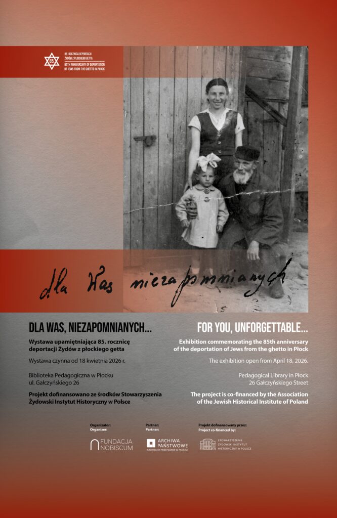 Z tej okazji zapraszamy do Biblioteki Pedagogicznej w Płocku na wyjątkową wystawę upamiętniającą 85. rocznicę deportacji Żydów z płockiego getta. Wystawa przybliża i upamiętnia wybrane żydowskie rodziny związane z Płockiem.