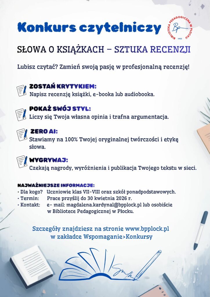 Biblioteka Pedagogiczna w Płocku zaprasza uczniów klas VII–VIII oraz szkół ponadpodstawowych z Płocka i powiatu płockiego do udziału w konkursie literackim.