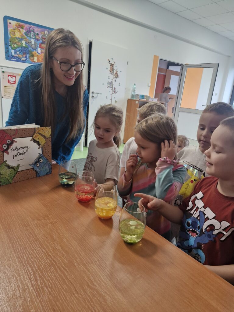 Dzieci rozmawiały o emocjach, które pojawiają się w codziennych sytuacjach i mogą być bardzo intensywne. Wspólnie tworzyły buzujące „potworkowe szklanki”, w których zamknęły różne uczucia, a następnie wykonywały zadania związane z rozpoznawaniem i nazywaniem emocji.