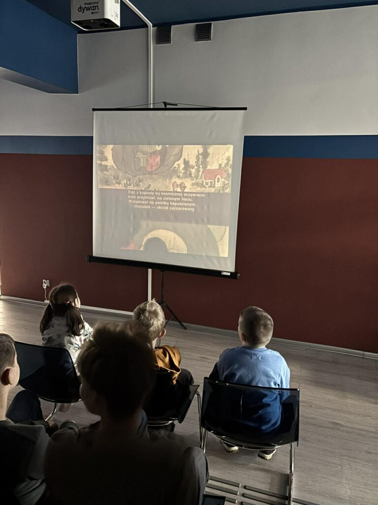 Kolejnym punktem programu był seans bajki „Przygody kosmoludka”, wyświetlonej za pomocą klasycznego rzutnika Ania. Na zakończenie wizyty wszyscy oddali się relaksowi pod nocnym niebem, wyświetlonym na interaktywnej podłodze „Magiczny Dywan”.