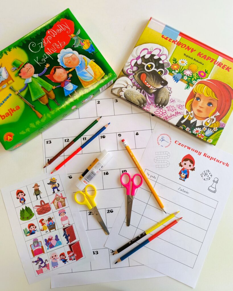 Inspiracją do dalszej pracy była wysłuchana wspólnie baśń „Czerwony Kapturek”. Następnie uczestnicy, pracując w grupach, projektowali własne gry planszowe inspirowane treścią bajki – tworzyli plansze, wymyślali zadania oraz autorskie zasady gry. Nie zabrakło kreatywnych pomysłów, współpracy i dobrej zabawy.
