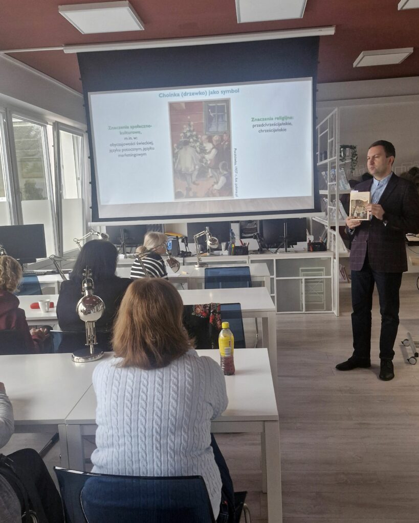 W świąteczny nastrój wprowadził nas dr Marcin Lutomierski, opowiadając o niezwykłej historii choinki. Choć mogłoby się wydawać, że o Bożym Narodzeniu, tradycji i regionalizmie wiemy już naprawdę dużo, okazało się, że to drzewko skrywa wiele tajemnic, a jego obecność w literaturze zachwyciła uczestników.