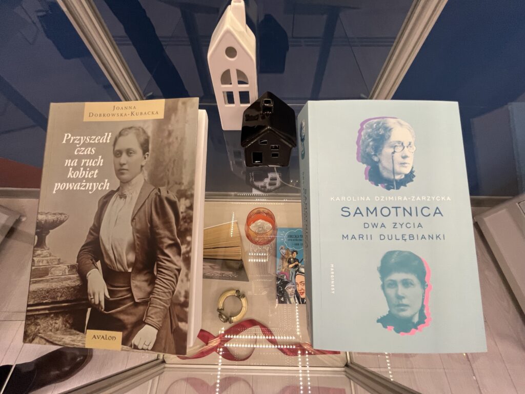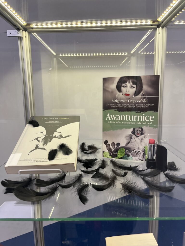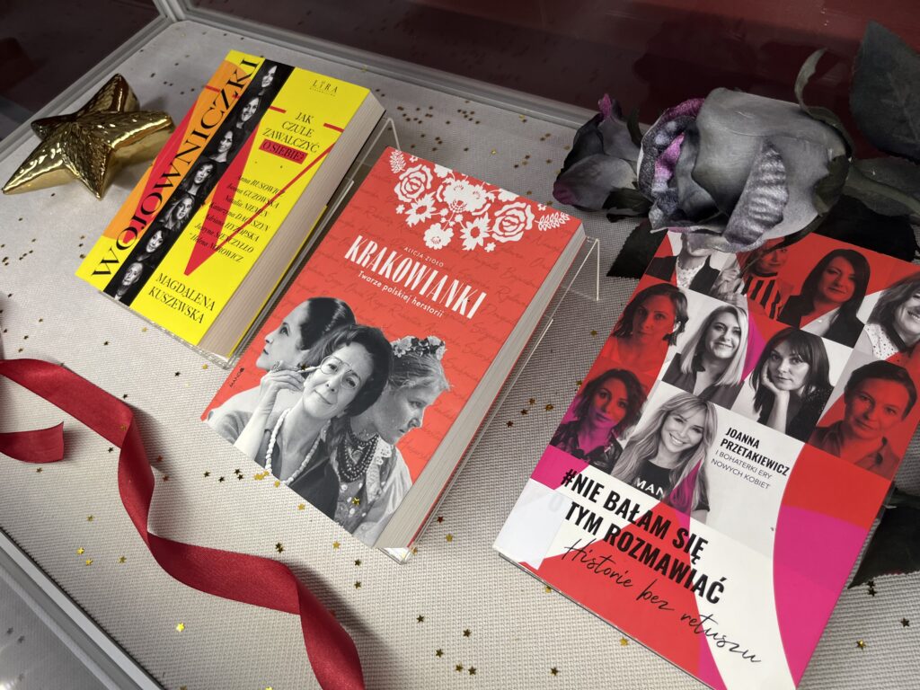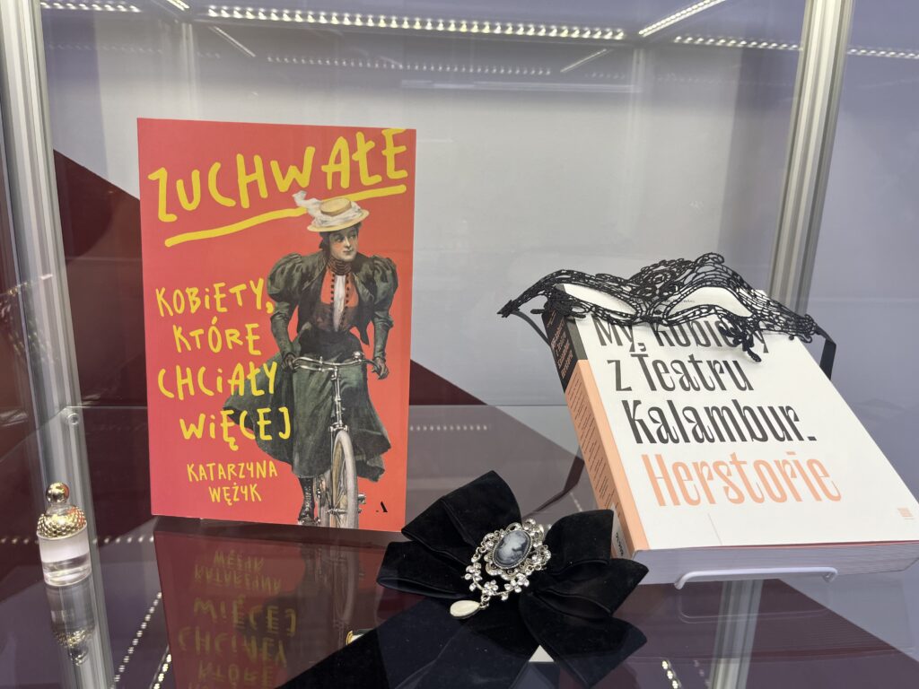 W gablotach wyeksponowano bogaty zestaw publikacji prezentujących różnorodne herstorie – od wielkich biografii po osobiste świadectwa i analizy społecznych przemian.